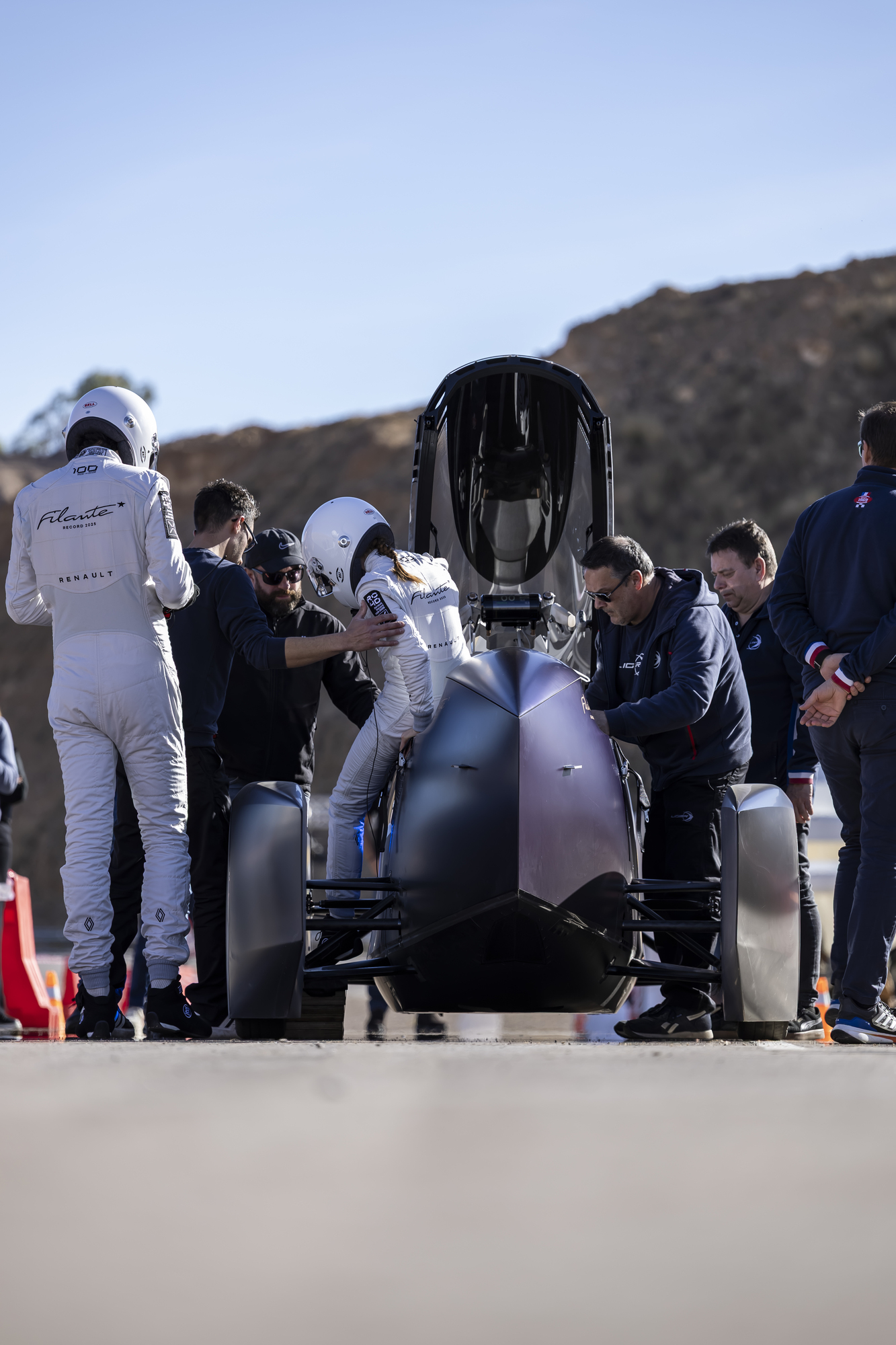 Trei piloți se vor roti la volanul mașinii demonstrative, în ture de aproximativ două sau trei ore. La 7:50 dimineața, Laurent Hurgon își pune casca, apoi mănușile. Se urcă în mașină și cockpitul se închide. Startul este programat pentru ora 8 dimineața, imediat ce apare prima lumină a zilei. E timpul pentru un test real de anduranță. Contact, primele rotații, Filante Record 2025 pornește spre destinul său.