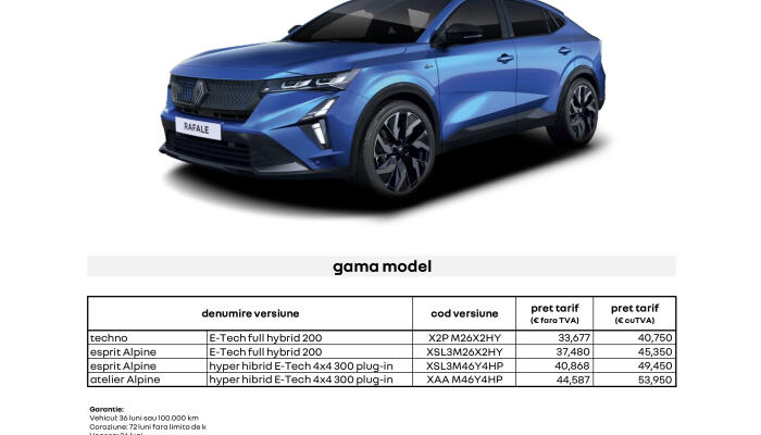 - Rafale MY 2026 - de la 40,750 € cu TVA. Rata de leasing: de la 229 € (tva inclus)/ lună* prin Renault Finance.